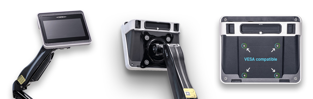 The MultiLab® Pro IDS has VESA-compatible threads, allowing it to easily attach to standard monitor mounts. VESA stands for the Video Electronics Standards Association, which developed the Flat Display Mounting Interface (FDMI), the international standard for mounting flat screens, monitors, and TVs. Use your favorite search engine to learn more about the VESA standard and suitable mounting systems.
